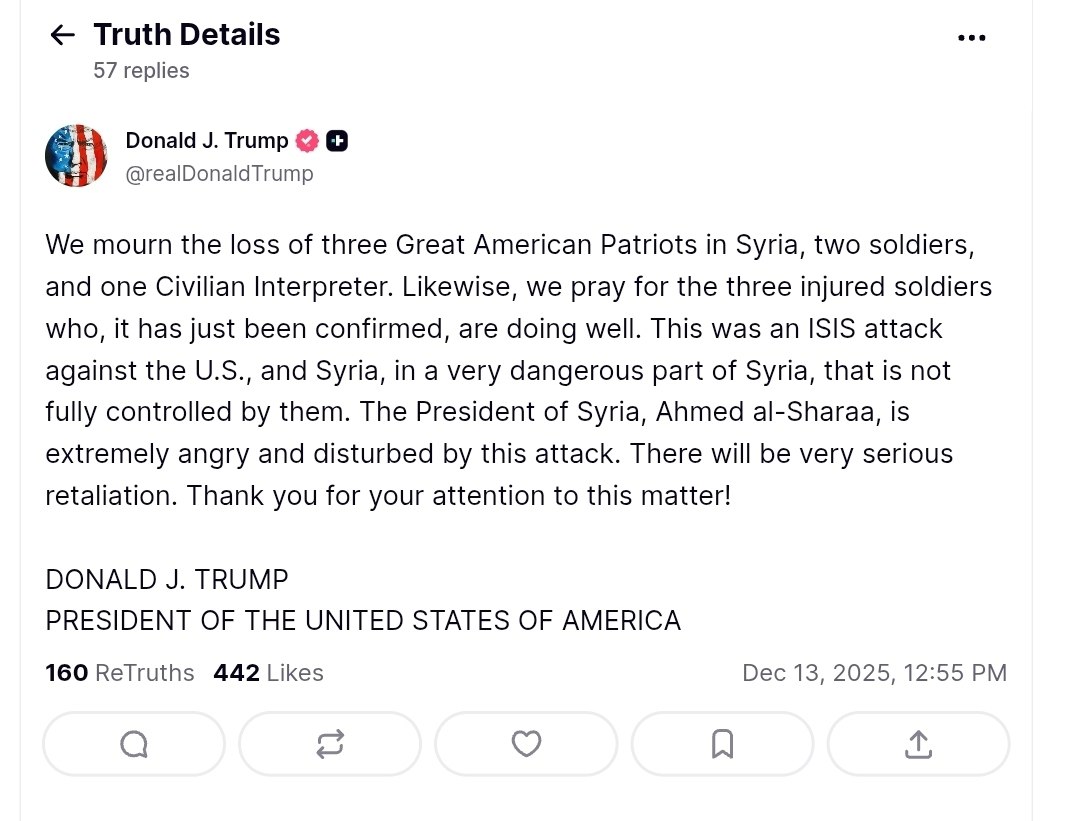 President Trump confirmed the deaths of two U.S. soldiers and one civilian interpreter in a post on Truth Social, expressing deep sorrow over the loss of what he termed "three Great American Patriots." He also mentioned that three additional soldiers were injured in the attack but are reportedly in stable condition. The President emphasized the nature of the attack, labeling it as an ISIS assault against the United States and highlighting the ongoing threat posed by the terrorist organization in Syria.