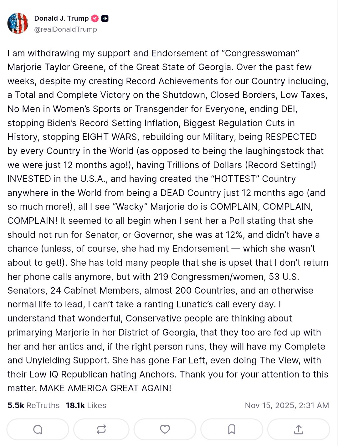 US President Donald Trump has withdrawn his endorsement of Representative Marjorie Taylor Greene (R-GA), citing ongoing complaints and a perceived shift towards the "Far Left." This decision was made public on Saturday, November 15, 2025.