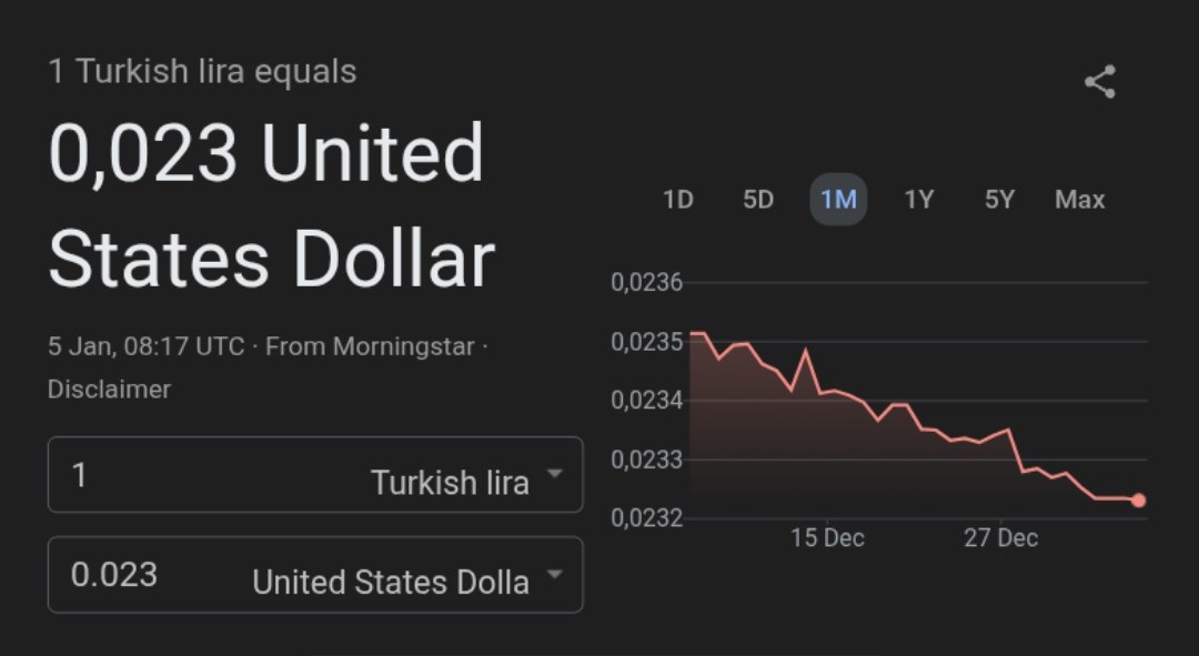 Turkey"s currency, the Turkish lira, has weakened to a new all-time low, trading at approximately 43 TRY per USD. This marks a significant decline in the value of the lira against the US dollar.