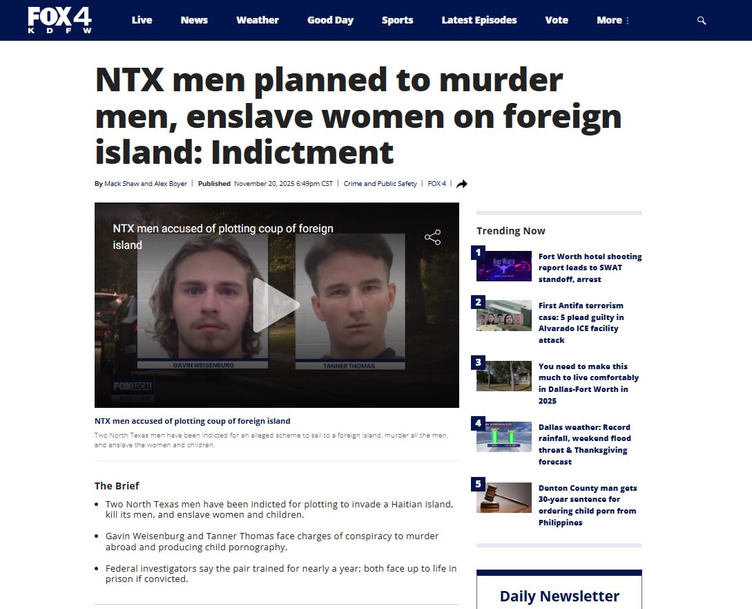 Two men from North Texas have been indicted on serious charges related to an alleged plot to travel to a foreign island with the intent to commit heinous crimes, including murder and enslavement. Gavin Rivers Weisenburg, 21, from Allen, Texas, and Tanner Christopher Thomas, 20, from Argyle, Texas, face multiple charges stemming from their extensive plans to execute a violent coup d"état on Gonâve Island, which is part of the Republic of Haiti.