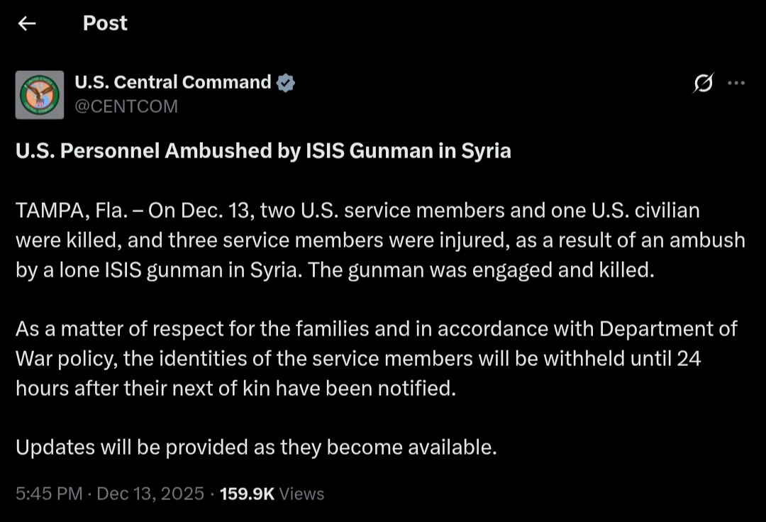 On December 13, 2025, a tragic incident occurred in Syria, resulting in the deaths of two U.S. service members and one U.S. civilian. The ambush was carried out by a lone gunman affiliated with the Islamic State (ISIS). In addition to the fatalities, three other service members sustained injuries during the attack. The U.S. Central Command confirmed that the assailant was engaged and subsequently killed by U.S. forces.