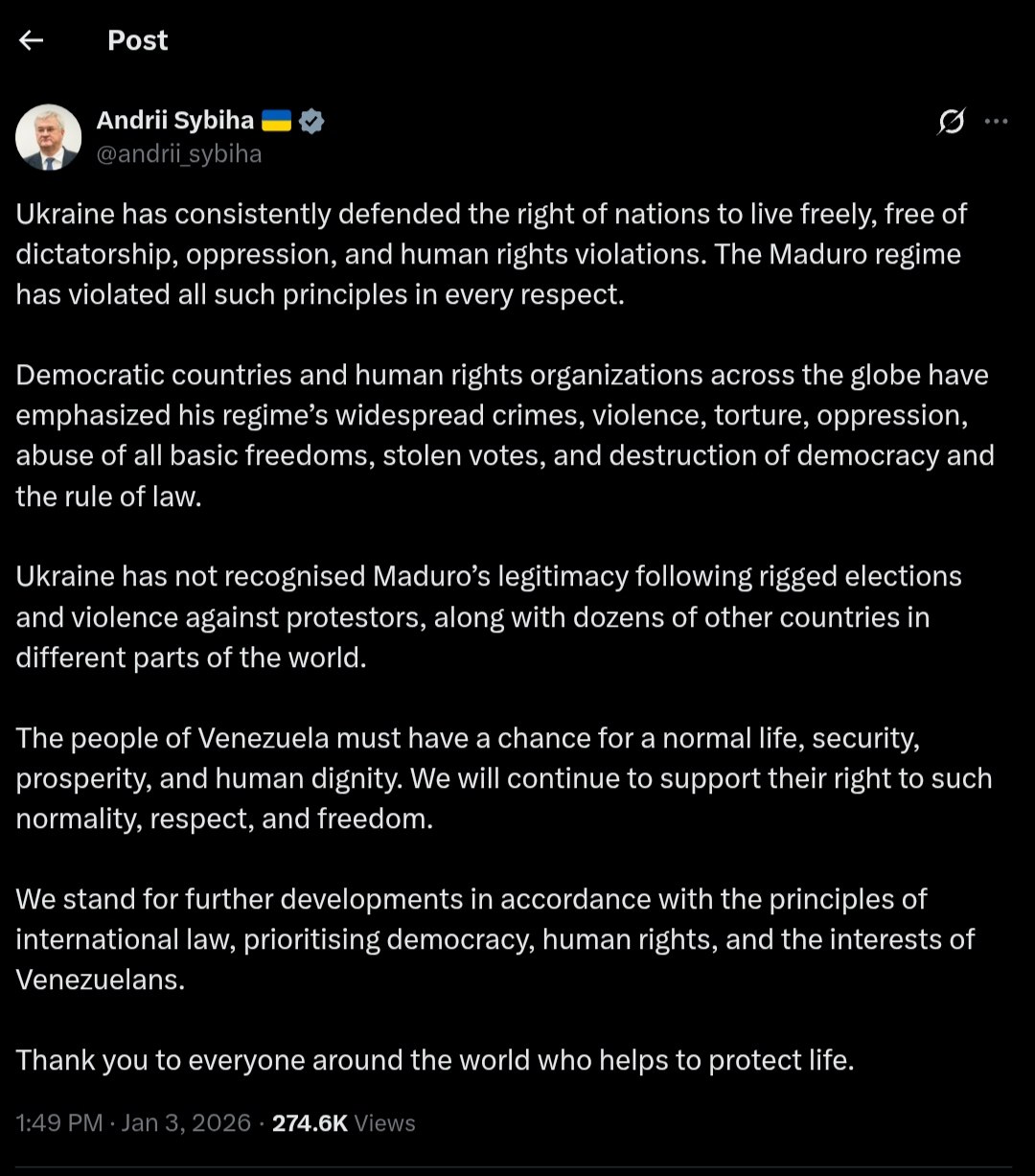 Ukrainian Foreign Minister Andrii Sybiha stated that Ukraine does not recognize the legitimacy of Venezuelan President Nicolás Maduro. This position is based on allegations of rigged elections and violence against protestors under Maduro"s regime. Sybiha emphasized that Ukraine has consistently defended the right of nations to live freely, without dictatorship, oppression, and human rights violations, principles he claims the Maduro regime has violated.