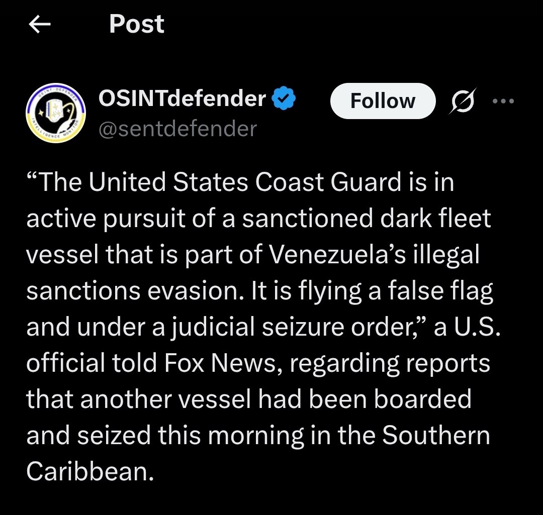 The United States Coast Guard is actively pursuing a vessel that is under sanctions for evading Venezuelan regulations. The vessel is reportedly flying a false flag and is subject to a judicial seizure order, according to a U.S. official who spoke to Fox News. This development follows reports of another vessel being boarded and seized earlier today in the Southern Caribbean.