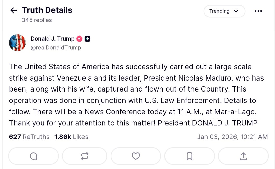 On January 3, 2026, U.S. President Donald Trump announced that the United States has successfully executed a large-scale military operation against Venezuela, resulting in the capture of President Nicolas Maduro and his wife. The couple has been taken out of the country as part of this operation, which was conducted in coordination with U.S. law enforcement agencies.