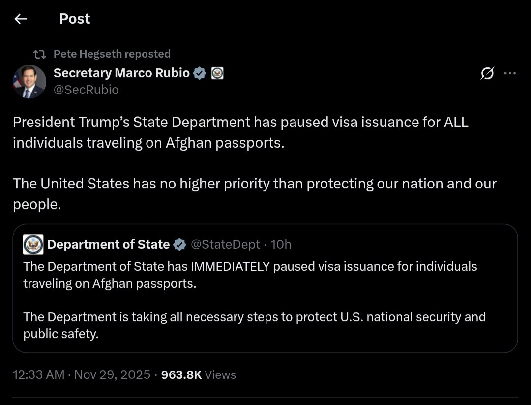 The U.S. Department of State has paused the issuance of visas for individuals traveling on Afghan passports, effective immediately. This decision was announced on Saturday, November 29, 2025.