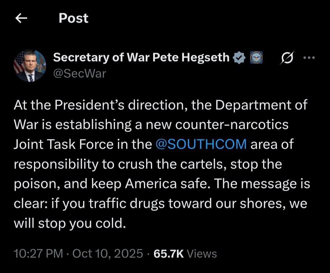 US Secretary of War Pete Hegseth announced that, at the direction of the President, the Department of War is establishing a new counter-narcotics Joint Task Force in the SOUTHCOM area of responsibility. The initiative aims to combat drug cartels, halt the influx of illegal drugs, and enhance safety in the United States.