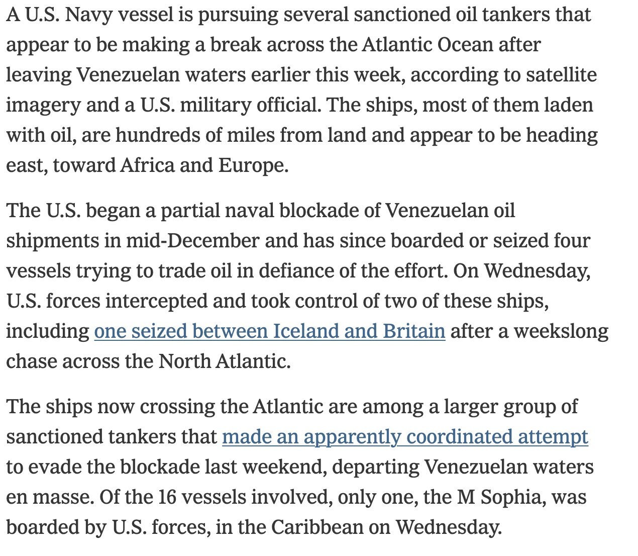 A U.S. Navy vessel is currently pursuing several sanctioned oil tankers that have reportedly left Venezuelan waters earlier this week and are making their way across the Atlantic Ocean. This information comes from satellite imagery and a U.S. military official, as reported by the New York Times.