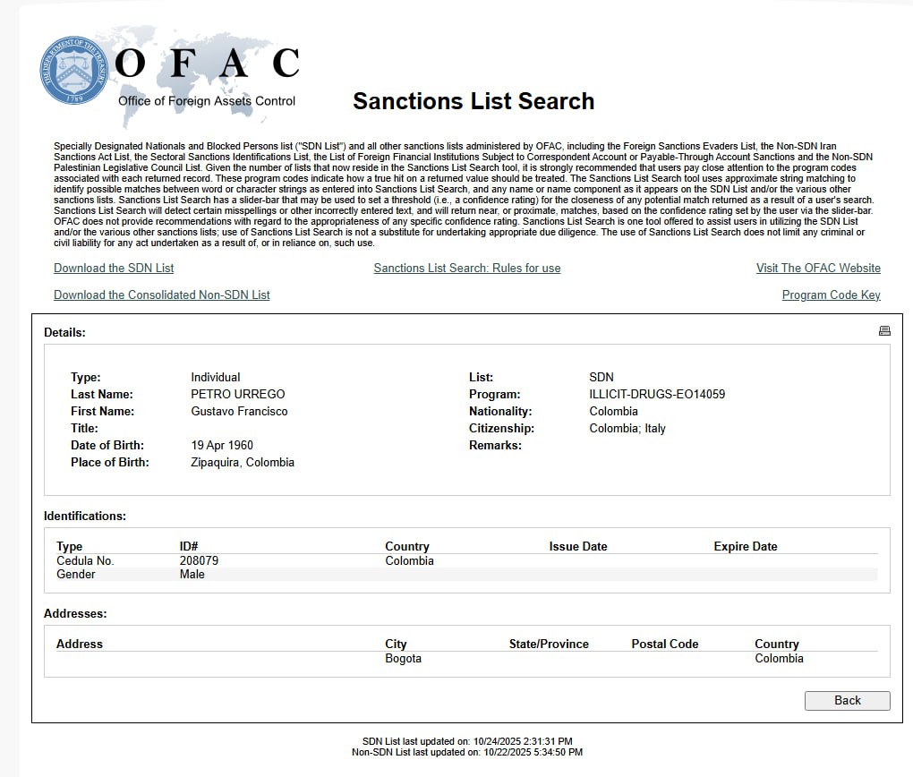 On October 24, 2025, the United States" Office of Foreign Assets Control (OFAC) announced sanctions against Colombian President Gustavo Petro, his wife Verónica Alcocer García, and their son Nicolás Petro Burgos. The sanctions are part of the OFAC"s Counter Narcotics Designations.