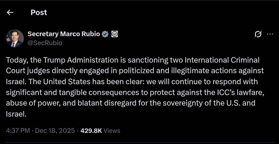 US Secretary of State Marco Rubio announced today that the Trump Administration has imposed sanctions on two judges of the International Criminal Court (ICC). These sanctions are in response to what the administration describes as politicized and illegitimate actions taken against Israel.