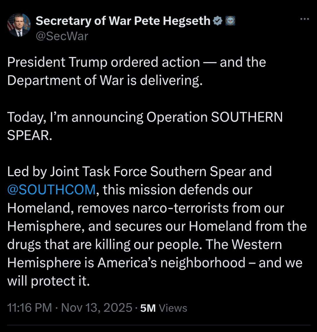 US Secretary of War Pete Hegseth announced the launch of Operation "SOUTHERN SPEAR," aimed at removing narco-terrorists from the western hemisphere. The announcement was made on Friday, November 14, 2025.