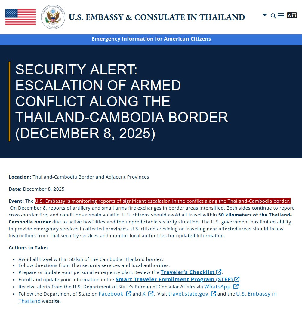 On December 8, 2025, the U.S. State Department issued an emergency travel warning advising U.S. citizens to avoid "all travel" within 50 kilometers of the Thailand-Cambodia border. This warning comes in response to a "significant escalation in the conflict" between the two countries.
