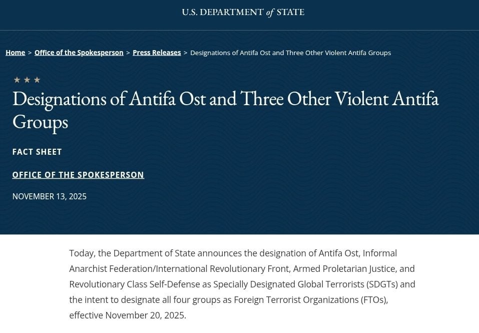 The U.S. State Department is set to designate four Antifa groups as Foreign Terror Organizations by November 20th, 2025. The groups included in this designation are: