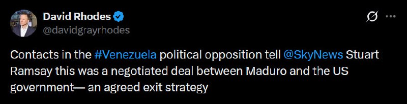 Sky News journalist David Rhodes reported that members of the Venezuelan opposition have contacted his news organization, claiming that President Nicolás Maduro accepted a surrender deal from the United States. This assertion indicates that Maduro was not forcibly taken to the U.S. for prosecution.